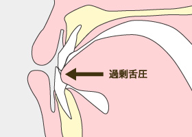上顎の前歯の後ろにある膨らみの部分をスポットと言い、このスポットに舌の先を付け、奥歯を軽く噛むように唇を閉じた状態が正常な舌の位置です。いつも歯に押し付けているような舌癖があったり、舌を上に持ち上げられないと舌の位置が低くなります。そうすると、舌によっていつも前歯が押し広げられて徐々にすき間が出来ていきます。